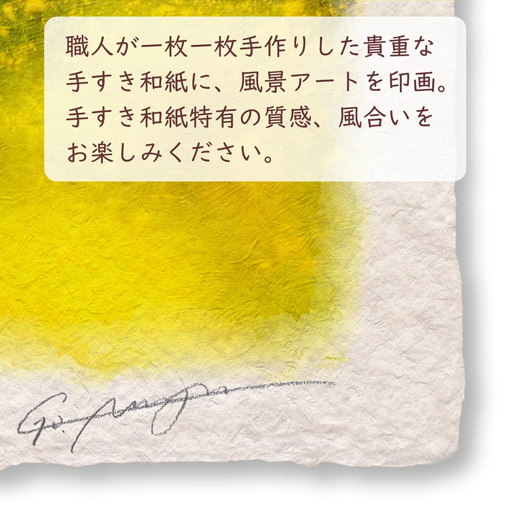 「和紙の絵写真」とは、作家自身が撮影した風景写真をベースに、作家の思い出の風景をイメージして作成した絵画調のデジタルアートを、職人が一枚一枚手すきした和紙に印画した新感覚のアートプリントです。