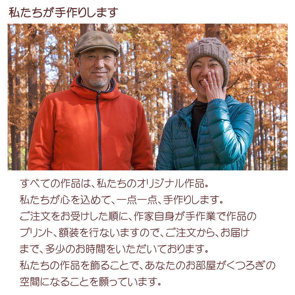 ご注文をお受けした順に、作家自身が手作業で作品のプリント、額装を行ないますので、お届けまで多少のお時間をいただいております。